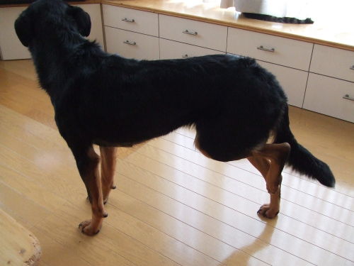 朝起きて、お犬さま達に1匹づつ朝のご挨拶をしていたらメイが左後ろ足を地面につけません。