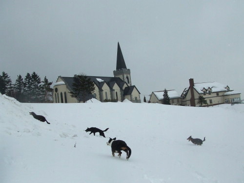 お犬さま達は教会をバックに・・・やはり爆走・・・