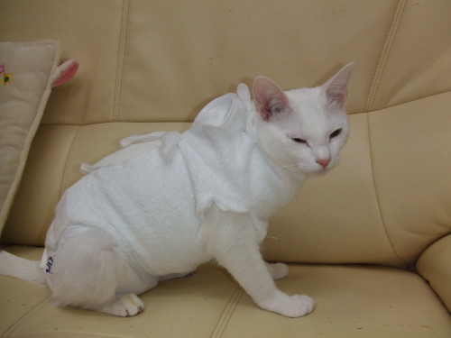 傷口を舐めないように、T獣医師がタオルで手作りの服を作ってくれました。エリザベスカラーじゃ歩きにくいもんね~。良かったねぇ。