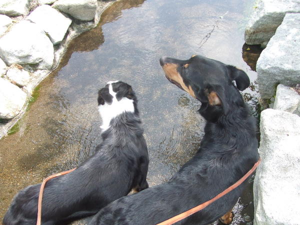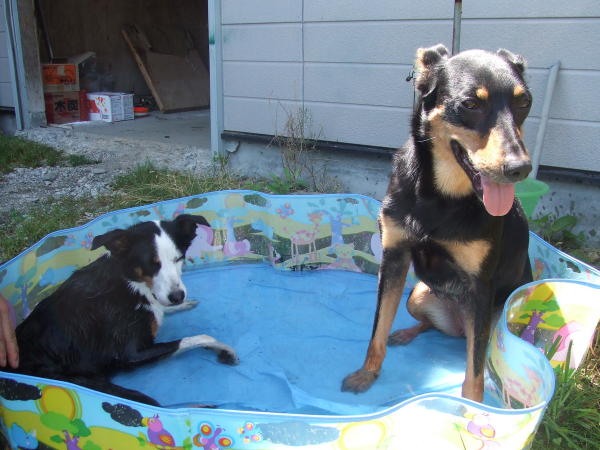 水に浸かってご満悦の2匹♪デンボくんはどんなに暑くても水には