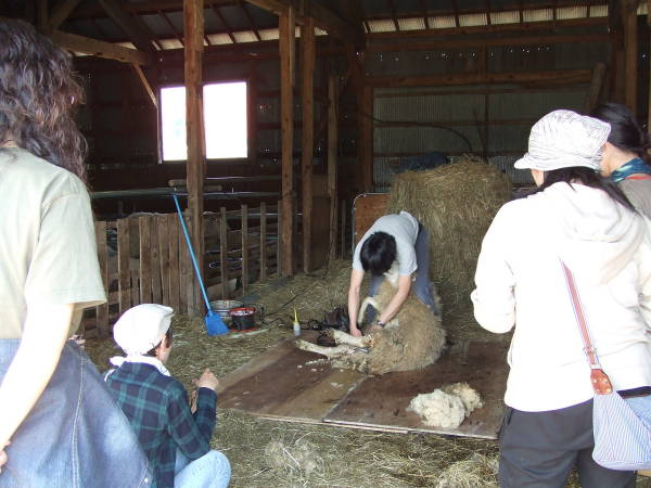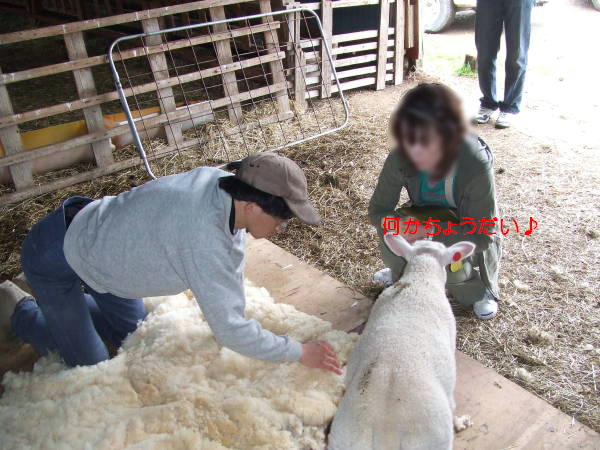 刈った毛の説明中。子羊ちゃんが邪魔をしてます(^_^;