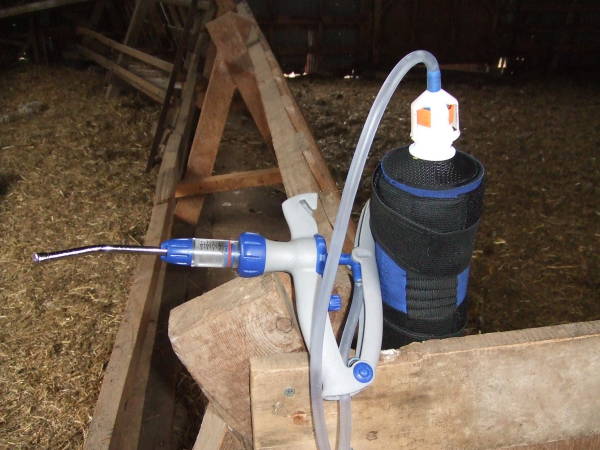 お薬の入ったボトルを腕に固定し、ピストル部分をひつじさんの