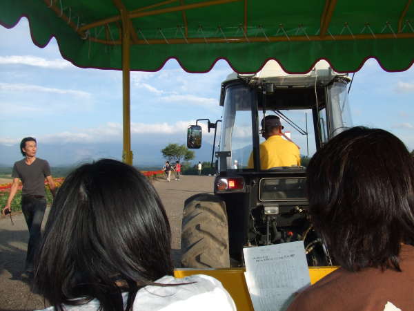 トラクターで引っ張ってもらう「トロッコ号」で出発~