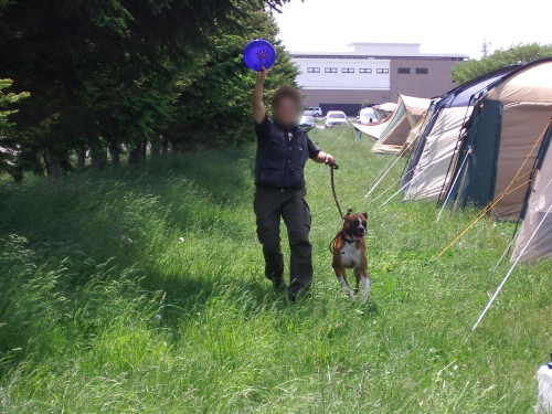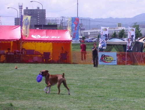 16組くらいのエントリー数で周りはボーダ・ーコリー、ウィペット、ラブラドールなど流行犬種のディスクドッグばかり。